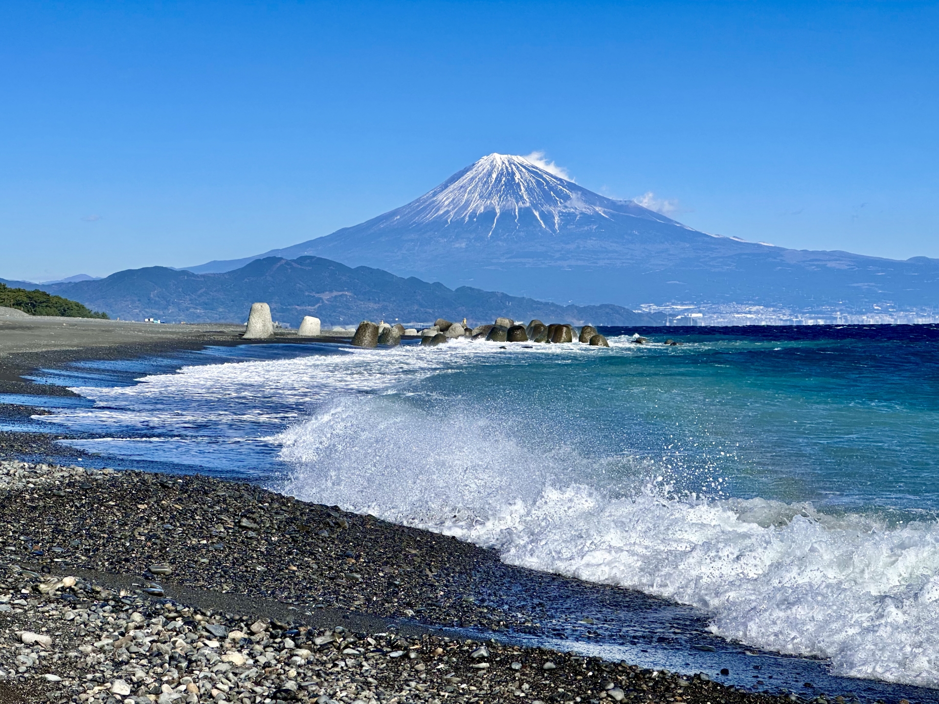 三保松原から少し足を延ばした清水海岸も、富士山撮影には見逃せないスポットです。ここでは、松並木とは異なり、より開けた視界で、雄大な富士山を捉えることができます。特に、広大な砂浜が手前に広がるため、独特の構図が可能です。