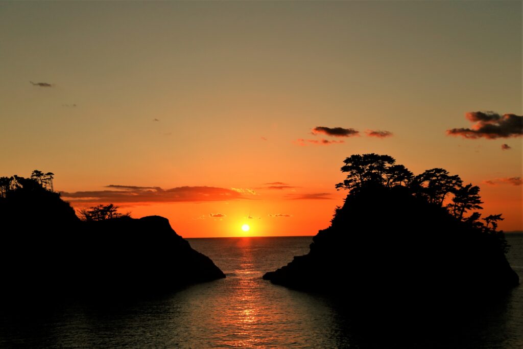 大田子海岸 「日本の夕陽百選」に認定されており、特に春分の日と秋分の日の前後には、男島と女島の間に夕日が沈む神秘的な光景が見られます。奇岩「メガネッチョ」も人気の撮影ポイントです。 3月・9月(春分・秋分の日の前後)