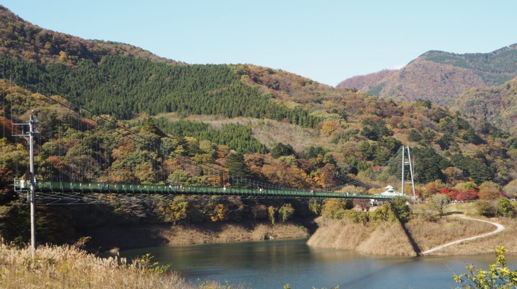 渓流チェアを設置している箒川沿いには、美しい遊歩道や吊り橋が整備されています。特に「もみじ谷大吊橋」は、全長320メートルの無補剛桁歩道吊橋として有名で、眼下に広がる箒川の清流と豊かな自然を空中散歩気分で楽しめます。川のせせらぎを聞きながらの散策は、心安らぐ時間となるでしょう。