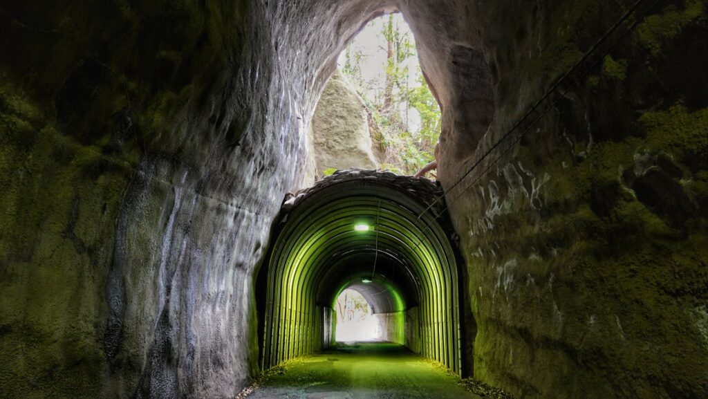梅ヶ瀬渓谷トレッキングのハイライトの一つが、人工的に掘られたトンネル「弘文洞跡」です。かつては弘文洞という名称のトンネルでしたが、崩落により現在はその跡が残るのみとなっています。この場所は、その独特な景観から、多くの観光客やハイカーを魅了しています。