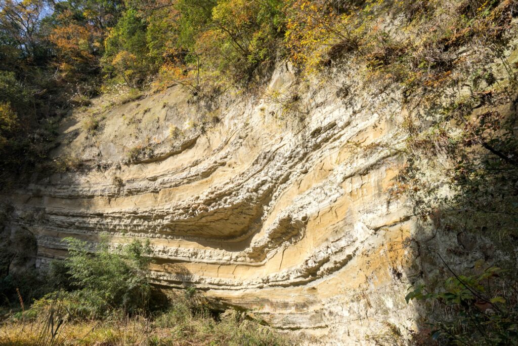 弘文洞跡へは、月崎駅や上総大久保駅から養老川沿いの道を歩いて向かいます。道の途中では、奇岩や清流が織りなす美しい渓谷美を楽しむことができます。特に、川の流れによって削られた地層がむき出しになった場所は、地球の歴史を感じさせる壮大な景色です。道中には、小さな滝や淵も点在しており、自然の造形美を間近で観察できます。