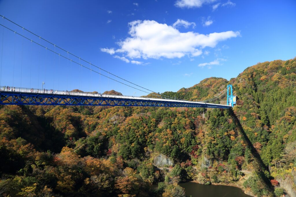 竜神大吊橋が架かる竜神峡は、V字形の美しい渓谷が特徴で、四季を通じて訪れる人々の目を楽しませてくれます。 特に、鮮やかな新緑が渓谷を包む春と、山々が燃えるような赤や黄色に染まる秋の紅葉シーズンは必見です。歩行者専用橋としては本州一の長さ375mを誇る橋の上をゆっくりと歩きながら、360度のパノラマビューを満喫できます。 季節ごとの渓谷の表情は、訪れるたびに新しい発見と感動を与えてくれるでしょう。