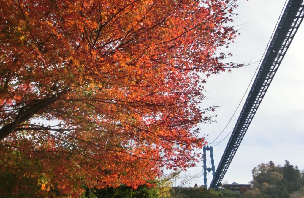 撮影する際に、手前に色鮮やかな紅葉の枝葉を意図的に入れてみましょう。手前の紅葉が「額縁」の役割を果たし、奥にある竜神大吊橋を際立たせることで、奥行きのある立体的な写真に仕上がります。特に、橋の全体像が見える展望スポットからこの構図を試すと効果的です。