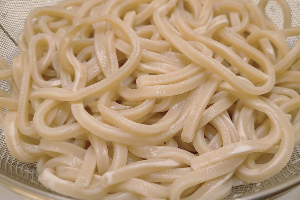 4. 茹で上がったら、素早くザルにあげ、冷水でよくもみ洗いし、ぬめりを取ります。これにより、うどんのコシが引き締まります。温かいうどんとして食べる場合は、再度熱湯にくぐらせて温めてください。