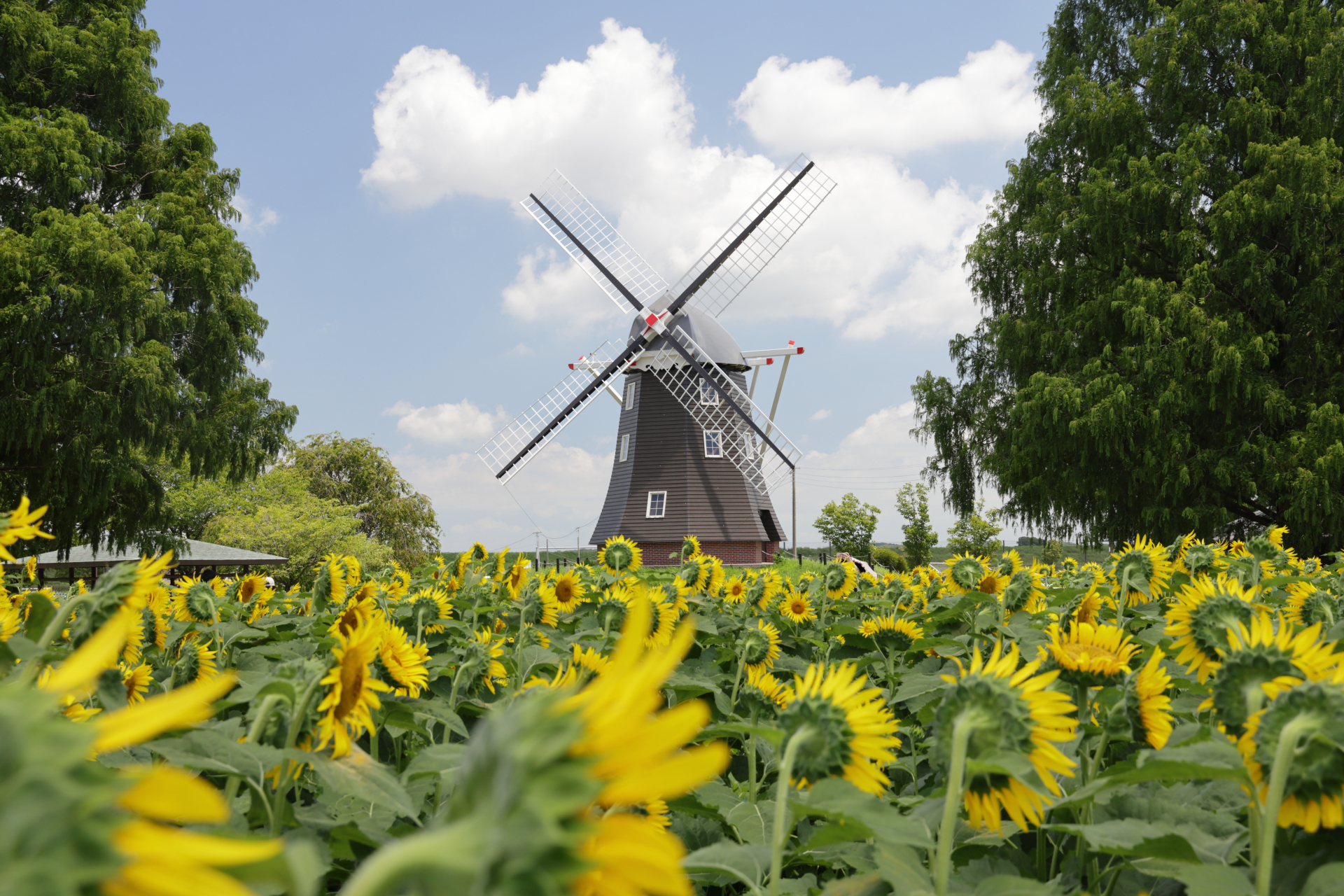 広大な敷地には、年間を通して様々な花が咲き、訪れる時期によって異なる表情を見せてくれます。特に、春のチューリップや桜、初夏のアジサイや花しょうぶ、秋には一面に広がるコスモス畑が有名です。園内にはシンボルである風車もあり、花畑とのコントラストはフォトジェニックで、一人旅の思い出作りにぴったりです。