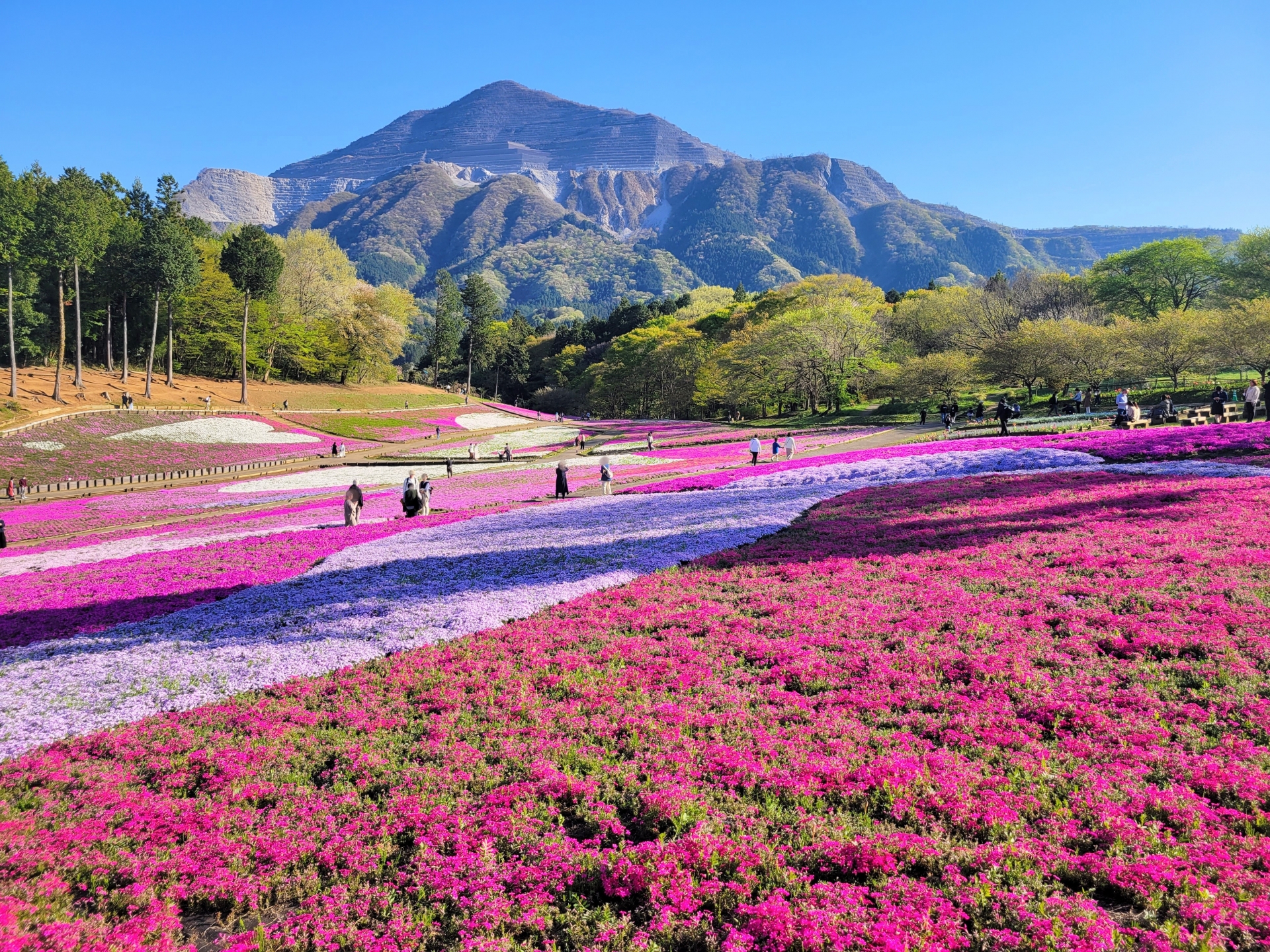 秩父市にある羊山公園は、四季折々の花が楽しめる広大な公園です。特に4月中旬から5月上旬にかけて見頃を迎える「芝桜の丘」は、ピンクや白、青紫など色とりどりの芝桜が絨毯のように咲き誇る絶景で、多くの観光客を魅了します。 芝桜の丘からは、武甲山の雄大な姿も一緒に眺めることができ、柔らかな花の美しさと無骨な山のコントラストが印象的です。 春には桜、初夏にはアジサイなど、季節ごとに異なる花々が楽しめます。 ゴールデンウィーク期間中は交通規制や混雑が予想されるため、早朝に訪れるのがおすすめです。