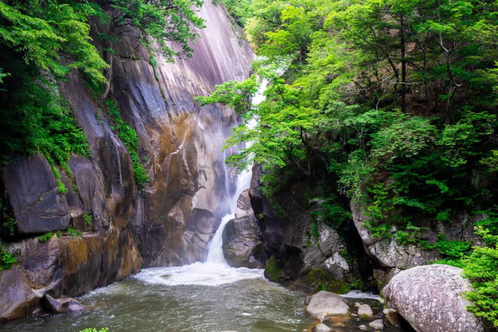 昇仙峡の奥部に位置する「仙娥滝(せんがたき)」は、落差30mを誇る壮麗な滝で、日本の滝百選にも選定されています。地殻変動によって形成された花崗岩の岩肌を勢いよく流れ落ちる様は迫力満点です。新緑、紅葉、そして雪景色と、四季折々に異なる表情を見せる仙娥滝は、特に秋の紅葉シーズンにはライトアップも行われ、幻想的な美しさを醸し出します。