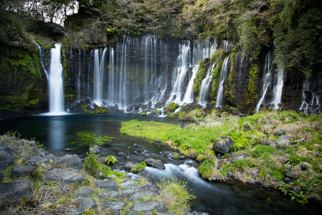 具体的には、水を通しやすい新富士火山の溶岩層(透水層)と、その下にある水を通しにくい古富士泥流層や集塊岩質泥流層(不透水層)との境目の絶壁から、大小数百もの水が湧き出しています。この構造により、水はまるで無数の白い絹糸が垂直に垂れ下がっているかのような、幻想的で優美な景観を創り出しているのです。年間を通じて水温は約11~12℃と安定しており、毎秒約1.5トンもの豊かな水量がこの絶景を支えています。この自然が織りなす芸術は、訪れる人々を日常から解き放ち、神秘的な世界へと誘います。