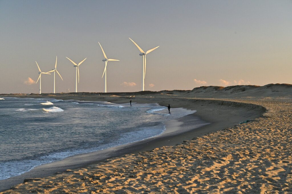 海岸線に沿って設置された十数基の巨大な風力発電用の風車は、波崎海岸のシンボル的存在です。夕日を背景に、ゆっくりと回る風車のシルエットが浮かび上がる光景は非常に幻想的で、ノスタルジックな雰囲気を醸し出します。風車を構図に取り入れることで、風景にダイナミックなアクセントを加えることができます。