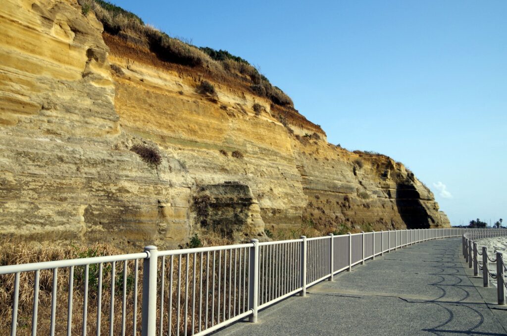 屏風ヶ浦の断崖には、約300万年前から数十万年前の間に堆積した地層が鮮明に露出しており、地球の歴史を物語る貴重な場所となっています。主に「犬吠層群(名洗層・飯岡層)」、「香取層」、そして「関東ローム層」の3つの主要な地層が確認できます。これらの地層は、かつてこの地域が深い海底であった時代から、徐々に浅い海となり、最終的には陸地へと変化していった過程を詳細に記録しています。