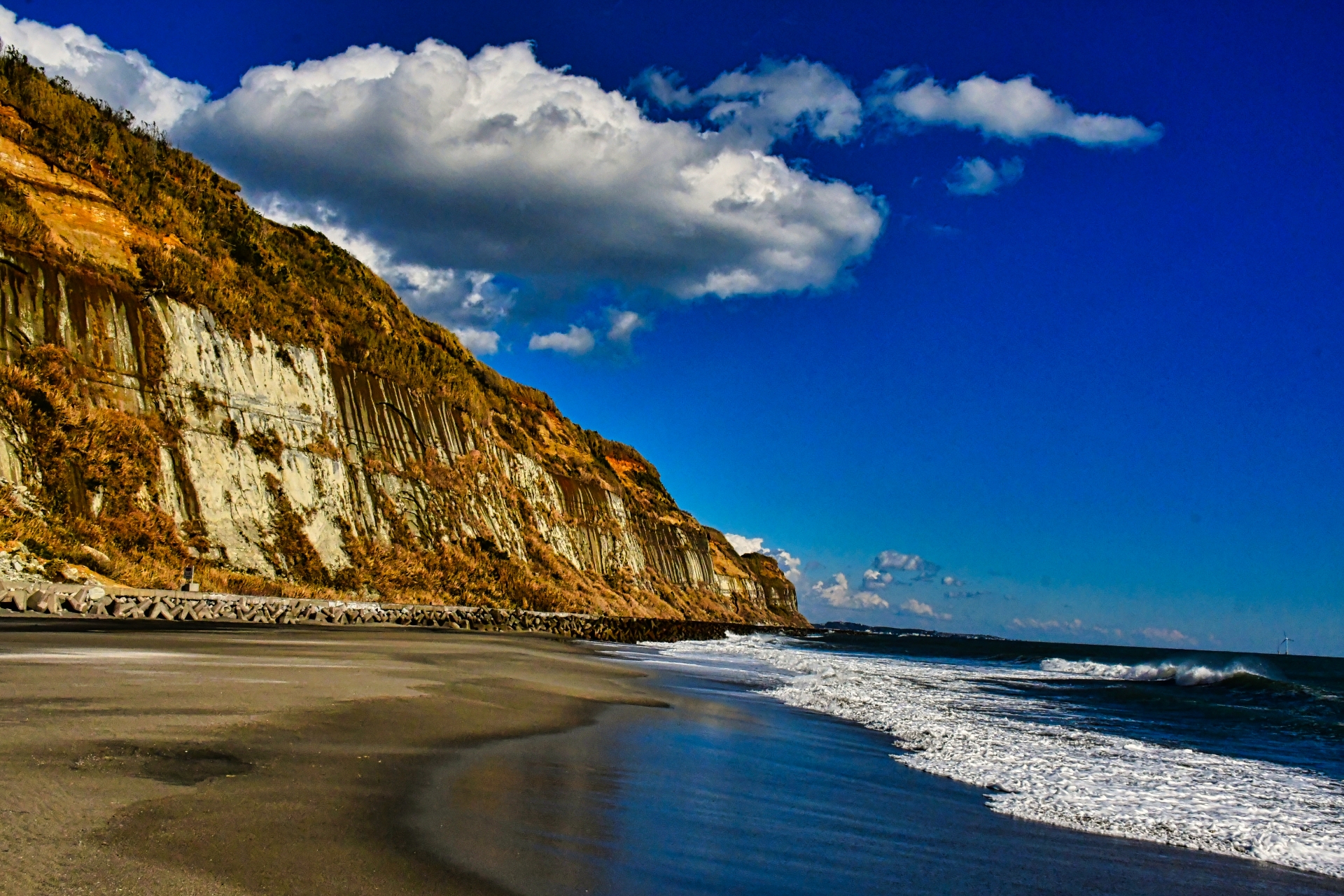 屏風ヶ浦の断崖には、約300万年前から数十万年前の間に堆積した地層が鮮明に露出しており、地球の歴史を物語る貴重な場所となっています。主に「犬吠層群(名洗層・飯岡層)」、「香取層」、そして「関東ローム層」の3つの主要な地層が確認できます。これらの地層は、かつてこの地域が深い海底であった時代から、徐々に浅い海となり、最終的には陸地へと変化していった過程を詳細に記録しています。