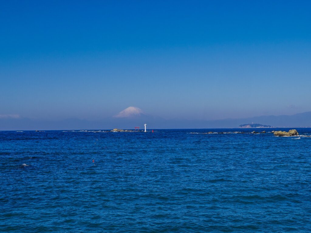 長者ヶ崎から望む景色は、まさに息をのむようなパノラマです。目の前には広大な相模湾が広がり、晴れた日には遠く伊豆半島や大島、そして江の島をはっきりと見渡すことができます。特に、西の空に沈む夕日と、その手前に浮かび上がる富士山のシルエットは、長者ヶ崎を訪れる最大の魅力の一つです。