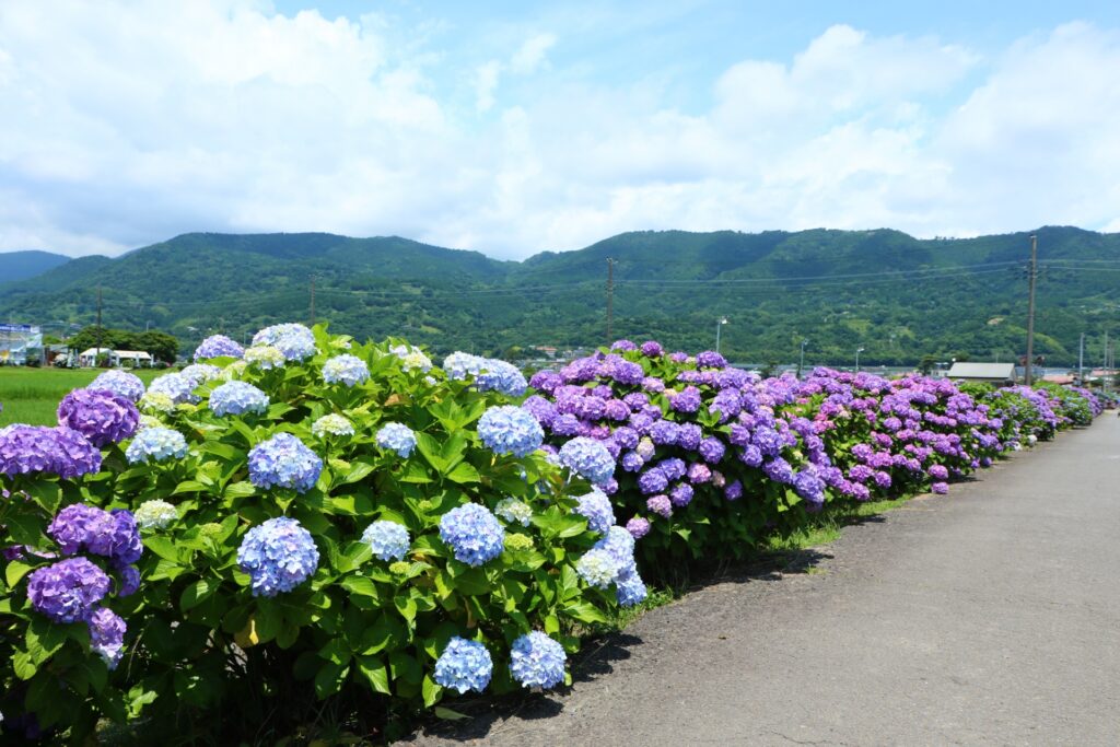| 広大な田園地帯のあじさいロード | 東京ドーム約3.6個分もの広大な水田地帯に、約5,000株のあじさいが植栽されており、青々とした田んぼと色鮮やかなあじさいのコントラストが圧巻です。特に田植えを終えたばかりの時期は、緑豊かな水田とあじさいの組み合わせが唯一無二の絶景を生み出します。 |